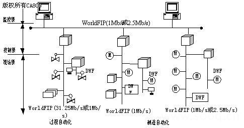 WorldFIP現(xiàn)場(chǎng)總線體系結(jié)構(gòu)如圖7所示,系統(tǒng)分為三級(jí),即過程級(jí)、控制級(jí)和監(jiān)控級(jí)。它能滿足用戶各種需要,適合于各種類型的應(yīng)用結(jié)構(gòu),集中型、分散型和主站/從站型。用單一的WorldFIP總線滿足過程控制、工廠制造加工和各種驅(qū)動(dòng)系統(tǒng)的需要。為了適應(yīng)低成本的要求,開發(fā)了低成本的Device WorldFIP(DWF)總線,它是設(shè)備一級(jí)網(wǎng)絡(luò),能很好適應(yīng)工業(yè)現(xiàn)場(chǎng)的各種惡劣環(huán)境,并具有本質(zhì)安全防爆性能,可以實(shí)現(xiàn)多主站與從主站的通信。