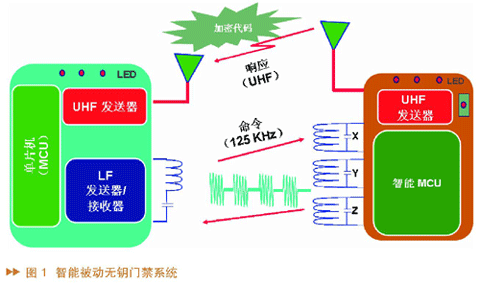 圖1所示是一個智能被動無匙門禁系統,圖示系統和普遍使用的系統有相似的地方也有完全不同的地方,左邊基站由一個單片機和高頻的發(fā)送器和低頻發(fā)送器與接收器組成,基站發(fā)出125KHz的低頻命令,當右面的智能接收器收到信號時會處理信號,信號達到一定的要求使用高頻或低頻作為響應。智能的接收器有3個接收方向XYZ,不管信號從哪個方向送來都可以接收到這個信號,而且使用者不需要任何的按鈕。這樣的智能接收器可以自動的接收信號、發(fā)送信號和處理信號。
