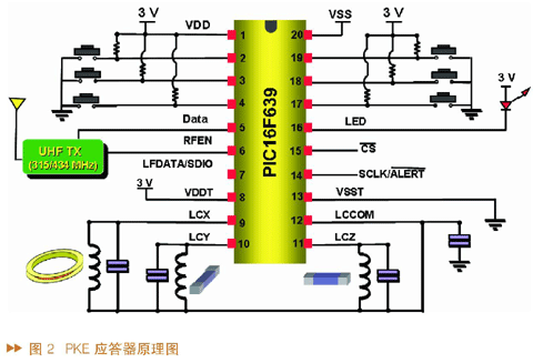 圖2所示是PKE應答器原理圖,圖中的PIC16F639是由PIC16F636和MCP2030構成,其中MCP2032是模擬前端,PIC16F636是另外一個單片機,使用PIC16F636和模擬前端組合在一起主要是因為PIC16F636有Keylock加密解密的功能,如果使用者不需加密解密功能則可以使用2030模擬前端和其他的單片機組合。