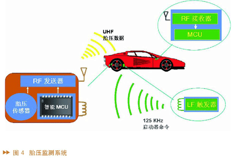 胎壓檢測系統(如圖4所示)的顯示組主要由三個單位組成:一個在輪胎里面,圖中左下角由智能單片機、胎壓傳感器和高頻發(fā)送器組成;右角上方是基站,主要由一個單片機和一個高頻的接收器組成;右方下角是低頻觸發(fā)器,一般放在靠近輪胎很近的車身部分,使用時每3或4秒低頻觸發(fā)器會發(fā)出一個啟動命令給輪胎單位,輪胎里面的智能單片機收到的信號達到要求時,會告訴胎壓傳感器去測量輪胎的溫度和胎壓,然后再由高頻發(fā)送器把胎壓的數據發(fā)給基站。