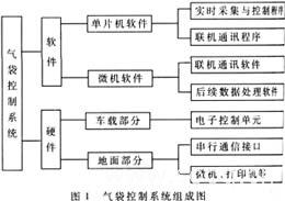 氣袋控制系統(tǒng)硬件由兩部分構(gòu)成,一部分是車載部分的電子控制單元,包括控制單片機(jī)、傳感器、點(diǎn)火電路、指示燈電路等;另一部分是地面部分,包括串行通訊電路和計(jì)算機(jī)系統(tǒng),以及打印機(jī)等后處理設(shè)備。