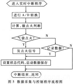 數(shù)據(jù)采集與控制程序主要負(fù)責(zé)實(shí)時(shí)數(shù)據(jù)采集,使用點(diǎn)火算法對(duì)所采數(shù)據(jù)進(jìn)行計(jì)算并作出判斷,發(fā)出點(diǎn)火信號(hào)。在點(diǎn)火后還要設(shè)置狀態(tài)代碼進(jìn)行數(shù)據(jù)保存等工作。為了全面分析不同的事故情況, 對(duì)不夠點(diǎn)火條件但仍有一定強(qiáng)度的事故也要記錄其波形,使系統(tǒng)具備"黑匣子"的功能。其流程如圖5所示。