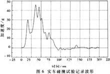 使用某型號(hào)國(guó)產(chǎn)轎車做控制系統(tǒng)的實(shí)車試驗(yàn),實(shí)測(cè)碰撞速度為49.2km/h??刂葡到y(tǒng)準(zhǔn)確地點(diǎn)爆了氣袋,并記錄了數(shù)據(jù)。圖6為這次試驗(yàn)控制系統(tǒng)記錄的碰撞波形。