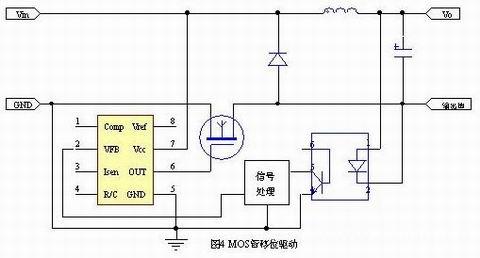 如圖四所示,將MOS管移到供電電源的負(fù)端,就可用IC輸出的信號(hào)直接驅(qū)動(dòng)。優(yōu)點(diǎn)是驅(qū)動(dòng)成本低,缺點(diǎn)一是輸出地懸浮,抗干擾性差;二是不能直接引進(jìn)反饋,需要再加光耦隔離傳送。