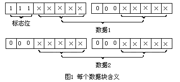閥門啟閉動(dòng)態(tài)轉(zhuǎn)矩檢測(cè)裝置與PC機(jī)之間采用RS232異步串行通信接口通信,數(shù)據(jù)傳輸速率為9600bps,1位開始位,8位數(shù)據(jù)位,1位停止位,無奇偶校驗(yàn)位。檢測(cè)裝置不斷發(fā)送檢測(cè)數(shù)據(jù)。每個(gè)數(shù)據(jù)塊由4個(gè)字節(jié)組成,第一個(gè)字節(jié)的前三位定義為二進(jìn)制常數(shù)1ll,是每個(gè)數(shù)據(jù)塊的開始標(biāo)志,其余3個(gè)字節(jié)的前三位均為二進(jìn)制常量000;每?jī)蓚€(gè)字節(jié)的后五位表示一個(gè)十進(jìn)制數(shù),高位在前,低位在后。如圖1所示。
