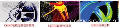 鋁輪轂設(shè)計開發(fā)的主要方法和流程是:市場調(diào)研、收集顧客需求和設(shè)計輸入等信息;綜合各種信息,繪制輪轂方案設(shè)計草圖并討論研究(如圖1a);方案初步確定后,利用三維軟件(如CATIA)將輪轂由方案草圖變?yōu)?/SPAN>3D數(shù)字模型(如圖1b),對設(shè)計進(jìn)行評審并與顧客交流;3D設(shè)計完成后,利用CAE軟件(如ANSYS軟件)進(jìn)行輪轂的應(yīng)力分析(如圖1c),根據(jù)分析的受力情況進(jìn)行結(jié)構(gòu)和重量的優(yōu)化設(shè)計再與顧客交流;優(yōu)化設(shè)計完成后,采用快速原型制造技術(shù)制造出輪轂的實物模型,與顧客共同對實物進(jìn)行評審;同步完成鑄造模具的設(shè)計,利用CAE軟件(如MAGMA軟件)進(jìn)行鑄造過程模擬分析,優(yōu)化模具設(shè)計和工藝方案設(shè)計;制造并試驗?zāi)>?,生產(chǎn)制造出真正的樣輪;對制造出來的樣輪進(jìn)行各種性能試驗和路試,只有樣輪經(jīng)過充分地試驗,證實其在行駛中的表現(xiàn)是優(yōu)秀的,一個新的鋁輪轂開發(fā)設(shè)計才算完成。