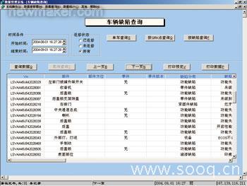 從圖中可以看出,在查詢?nèi)毕菪畔r,可以根據(jù)車號查詢單車缺陷信息,也可以結(jié)合時間段和缺陷狀態(tài)(是否被返工),按照需要查詢的質(zhì)量檢查點或缺陷類型進行查詢,查詢的結(jié)果將以車輛代碼為標(biāo)識。通過查詢可以得到缺陷對應(yīng)的車輛信息、發(fā)現(xiàn)缺陷檢出時所認(rèn)為對應(yīng)的部件、部件方位、零件、零件版本、所屬的缺陷種類、具體的缺陷描述、缺陷發(fā)現(xiàn)的時間、地點、人員、班次以及對該缺陷進行返修后認(rèn)定的缺陷對應(yīng)的部件、部件方位、零件、零件版本、缺陷描述、缺陷原因、返修工時、缺陷產(chǎn)生的責(zé)任部門、返工的時間、地點、人員及班次等信息。