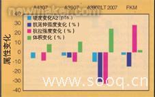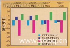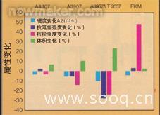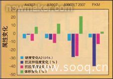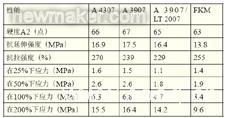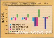 圖2 總結(jié)了在普通柴油機燃料中70℃老化一個星期后硬度和應力應變值的改變。所有的復合物在燃料中都軟化了,改變最大的是A3907/LT 共混物。在柴油機燃料中FKM 復合物容易喪失拉伸性能。A3907/LT 共混物在燃油沉浸中體積改變最大,然而A4307,A3907 和FKM 復合物體積膨脹都在10%以內(nèi)。A4307 和A3907 兩個混合物在柴油機燃料老化過程中所有的應力應變特性都表現(xiàn)出很少的改變。