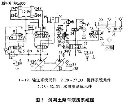 混凝土輸送泵車由混凝土輸送液壓系統(tǒng),攪拌液壓系統(tǒng),清洗液壓系統(tǒng),泵車支撐系統(tǒng)等組成。