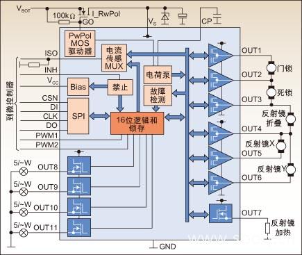 英飛凌公司支持這種方案的門模塊為TLE8200系列。主要功能包括用于驅(qū)動主控門鎖電機的全橋、多個支持死鎖、鏡位、折疊和除霜的半橋。還有多個驅(qū)動大電流的高性能電子開關,標準的SPI接口等。這些開關取代了原有的繼電器方案,在可靠性方面得到了很大改善,也根除了繼電器動作引起的機械噪聲。另外,內(nèi)含標準的16位SPI,以及各種保護功能,包括過溫、過壓和過流保護等,還具有完善的診斷功能。另外,劉魯偉還介紹:“通過采用這種方案,與第一種方案比較,僅這一項所節(jié)省的平均油料就高達0.2~0.3L/每百公里?!?nbsp;