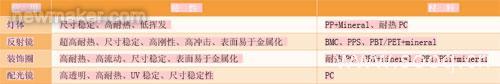 表1 汽車前大燈組件的特性要求和所適用的塑料材料