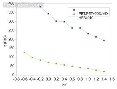 采用HAAKE Modular Advanced Rheometer System分別測試HEB4010和PBT/PET+20%MD(礦物填充)的粘度,測試結(jié)果如圖4所示。
