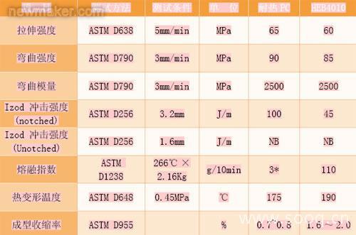 采用ASTM測試標準,實驗溫度23℃,濕度50%,對比測試了耐熱PC和HEB4010。測試結(jié)果見表4。