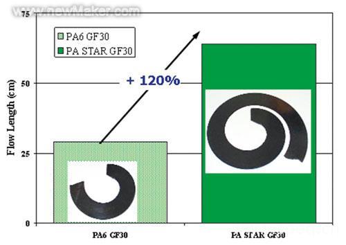 TECHNYL STAR和普通的PA6相比,它的螺旋流動長度增加了1倍