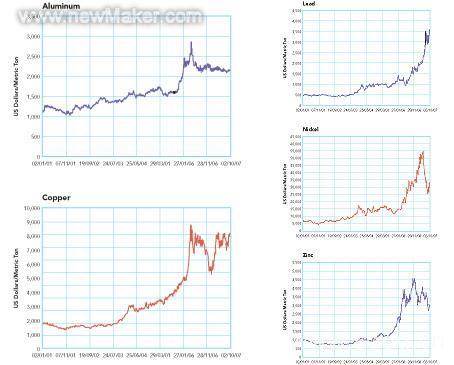 過去兩年間的金屬平均價格比前5年的價格提高3到4倍。亞洲持續(xù)增長的需求讓全球供應日趨緊張,金屬供應一度由于價格疲軟需求缺乏而停滯。至少在短期內(nèi)似乎已經(jīng)沒有希望,于是迫使人們找尋更加便宜的材料以及更加低成本的制造方法。以下是該形勢的曲線圖。所有數(shù)據(jù)來自倫敦金屬交易市場。