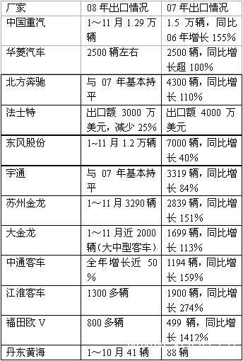 蘇州金龍08111月出口金額13.59億元人民幣,出口客車(chē)3290輛,全年增幅預(yù)計(jì)只有20%左右,與07151%的增幅相差甚遠(yuǎn)。福田歐V客車(chē)08年出口800多輛,增幅雖超70%,但歐V總經(jīng)理樊文堂告訴記者,08年下半年海外訂單少了很多。
