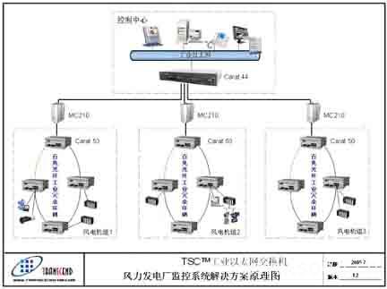 本設(shè)計(jì)方案針對(duì)風(fēng)力發(fā)電廠要求網(wǎng)絡(luò)必須具有實(shí)時(shí)采集功能、可擴(kuò)展、高可靠性、高帶寬、高質(zhì)量的網(wǎng)絡(luò)信號(hào)傳輸和冗余備份等特性,結(jié)合該網(wǎng)絡(luò)的實(shí)際情況,采用卓越信通的TSC工業(yè)以太網(wǎng)交換機(jī)及光纖收發(fā)器組建了工業(yè)級(jí)的光纖網(wǎng)絡(luò)。