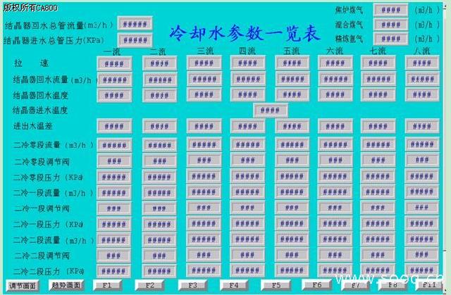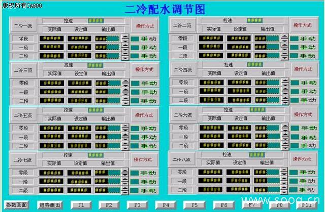 此畫面根據實際坯材的拉速,及時調整各個冷卻水管道的水量,畫面設計只要一鍵點擊即可將所有參數下裝,無須修改程序,有利于二冷配水表參數的修改。
