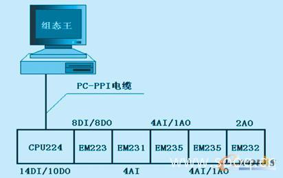 組態(tài)軟件選擇北京亞控公司的組態(tài)王6.05。這是一款具有易用性、開放性和集成能力的通用組態(tài)軟件。組態(tài)王使用簡(jiǎn)單,適合各種簡(jiǎn)單和復(fù)雜的任務(wù)。只需要進(jìn)行填表式操作,即可生成適合于用戶的“監(jiān)控和數(shù)據(jù)采集系統(tǒng)”,可有效用于控制自動(dòng)化過程, 組態(tài)王6.05版是在Windows2000的平臺(tái)上運(yùn)行的,因此選用組態(tài)王是較為完善和方便的選擇。整個(gè)控制系統(tǒng)的構(gòu)成如圖2所示: