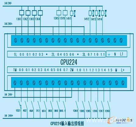 控制系統(tǒng)選用西門子S7-200系列PLC,選用了中央處理單元模塊CPU224、數(shù)字量擴(kuò)展模塊EM223、模擬量輸入模塊EM231、模擬量輸出模EM232、模擬量輸入輸出模塊EM235。其中的中央處理單元模塊CPU224外部接線圖如圖3所示、輸入輸出地址分配如表2所示: