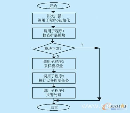 主程序框圖如圖4所示,其中子程序0為初始化程序,子程序1為檢查擴(kuò)展模塊是否正常,子程序2為模擬量采樣子程序,子程序3為對(duì)各執(zhí)行設(shè)備輸出的采樣,子程序4為對(duì)各被控量和執(zhí)行設(shè)備異常的報(bào)警子程序。由于篇幅所限,各子程序框圖在此從略。