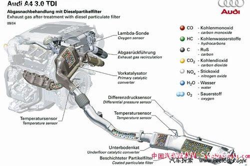 TDI技術(shù)使燃油經(jīng)由一個(gè)高壓噴射器直接進(jìn)入汽缸,因?yàn)榛钊數(shù)脑煨褪且粋€(gè)凹陷式的碗型設(shè)計(jì),燃油就在汽缸內(nèi)形成一股螺旋狀的混合氣,這使空氣和燃油混合得更為充分,燃燒更加理想,因此不但提高了功率輸出,降低了油耗,同時(shí)采用氧化型催化反應(yīng)器,大大降低了CO、HC、顆粒的排放,其中CO2排放與同排量汽油車比可降低30%。另外,采用電子排放控制,包括EGR(廢氣再循環(huán))系統(tǒng),大大降低了NOx產(chǎn)生。