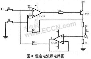 本設(shè)計采用集成有運放的線性恒流源。電路由兩個低漂移運放LM358、晶體管TIP41C、負(fù)載電阻R、限流電阻R3和直徑為1mm康銅絲繞制成的電流反饋采樣電阻Rf組成,如圖3所示。