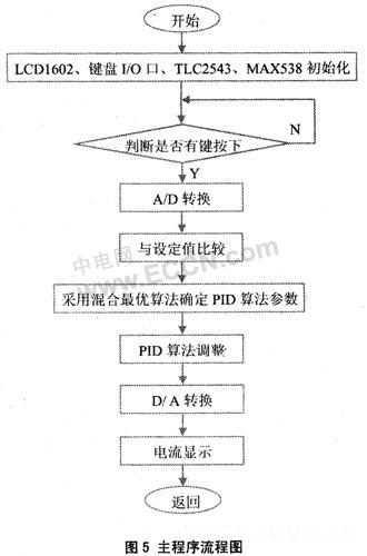 基于模塊化思想,系統(tǒng)軟件設(shè)計部分由C語言和匯編語言混合編寫而成,發(fā)揮了C語言高效運算和快速開發(fā)以及匯編語言的靈活的特點。系統(tǒng)軟件主要完成輸出設(shè)定、電流調(diào)整等功能。包括主程序、A/D采樣子程序、D/A輸出電流給定值及按鍵控制、PID算法子程序、混合最優(yōu)算法子程序、LCD顯示等其他子程序。