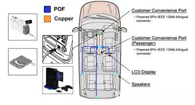 如圖所示,車(chē)載網(wǎng)絡(luò)的架構(gòu)可分為內(nèi)嵌式網(wǎng)絡(luò)和用戶(hù)便利端口(CCP)。目前的技術(shù)規(guī)格將內(nèi)嵌式塑料光纖(POF)車(chē)載網(wǎng)絡(luò)定義為與現(xiàn)有的MOST(媒體定向系統(tǒng)傳輸)技術(shù)相似的規(guī)格。但是,前者的架構(gòu)更加穩(wěn)固、能夠提供更高的數(shù)據(jù)傳輸速率,并且更易于實(shí)現(xiàn)。這個(gè)網(wǎng)絡(luò)能夠連接各種電子設(shè)備,例如DVD播放機(jī)、視頻顯示屏、導(dǎo)航系統(tǒng)、收音機(jī)接收設(shè)備、通訊設(shè)備,如無(wú)線電話(huà)或應(yīng)急自動(dòng)遠(yuǎn)程通信及信息處理技術(shù)術(shù)語(yǔ),以及其它的多媒體應(yīng)用。