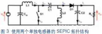 SEPIC 轉(zhuǎn)換器提供了一種降壓轉(zhuǎn)換,直到輸入電壓等于或者降到輸出電壓電平之下。然后,其將提供升壓轉(zhuǎn)換,直到電池電壓降至最小容許輸入電壓的電平。使用 SEPIC 的一個(gè)主要弊端是,它需要一個(gè)單耦合電感器(變壓器)或者兩個(gè)單獨(dú)電感器,以及一個(gè)耦合電容器,如圖 3 所示。