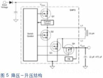 這種拓?fù)浣Y(jié)構(gòu)由一個(gè)降壓功率級(jí)及其兩個(gè)功率開關(guān)組成,這兩個(gè)開關(guān)又通過功率電感被連接至一個(gè)升壓功率級(jí)及其兩個(gè)功率開關(guān)。這些開關(guān)能夠以三種不同的運(yùn)行模式進(jìn)行控制:降壓-升壓模式、降壓模式和升壓模式。運(yùn)行的特殊芯片模式是輸入到輸出電壓比率的函數(shù),同時(shí)也是芯片的控制拓?fù)浣Y(jié)構(gòu)。