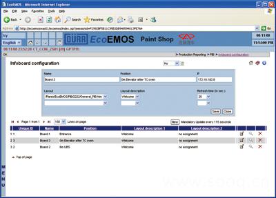 (2)生產(chǎn)信息板。EcoEmos監(jiān)控系統(tǒng)的特性之一是在生產(chǎn)信息板(PIB)上顯示生產(chǎn)數(shù)據(jù),該板也稱(chēng)為視頻板或信息板。該功能通過(guò)PIB視頻模塊實(shí)現(xiàn)。通常在設(shè)備或辦公室內(nèi)安裝數(shù)塊信息板,它顯示最重要的生產(chǎn)數(shù)據(jù)和出錯(cuò)、過(guò)程可視化、自備信息或歡迎屏幕,例如生產(chǎn)的車(chē)輛數(shù)量、應(yīng)急停止等。