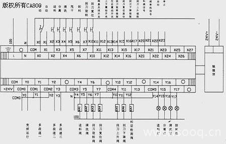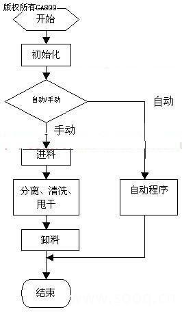 1.前言 1250離心機是立式刮刀卸料自動過濾離心機,主要用于固相為顆粒狀懸浮物料固液相分離,也可用于纖維狀物料固液相分離。礦物、環(huán)保、醫(yī)藥、化工等行業(yè)中廣泛應(yīng)用。目前多數(shù)離心機仍由繼電器控制,采用有級調(diào)速,離心機工作轉(zhuǎn)速調(diào)節(jié)單一、設(shè)備故障率較高,生產(chǎn)效率低下。為克服這些問題,我們對制藥廠1250離心機電控系統(tǒng)進行技術(shù)改造,采用PLC控制和變頻器調(diào)速,該系統(tǒng)自動化程度高、穩(wěn)定性好,運行可靠,現(xiàn)已成功應(yīng)用于多家制藥廠。 2.系統(tǒng)原理 離心機工作原理是將待分離物料經(jīng)進料管送入高速旋轉(zhuǎn)離心機轉(zhuǎn)鼓內(nèi),離心機力場作用下,物料濾布(濾網(wǎng))實現(xiàn)過濾,液相經(jīng)出液管排出,固相則截留轉(zhuǎn)鼓內(nèi),待轉(zhuǎn)鼓內(nèi)濾餅達(dá)到機器規(guī)定裝料量,停止裝料,對濾餅進行洗滌,同時將洗滌液濾出,達(dá)到分離要求后,離心機低速運轉(zhuǎn),刮刀裝置動作,將濾餅刮下,完成一次工作循環(huán)。圖1為1250離心機結(jié)構(gòu)圖。 離心機離心工藝過程:1)進料:當(dāng)變頻器速度達(dá)到20Hz時,首先打開進料閥、料層檢測閥,當(dāng)檢測到料層滿時,關(guān)閉進料閥并延時10S,料層滿信號消失再次打開進料閥連續(xù)執(zhí)行上述動作2次。2)離心:當(dāng)?shù)谌瘟蠞M信號產(chǎn)生時,關(guān)閉進料閥變頻器升速至50Hz進行高速分離,離心時間可由觸摸屏設(shè)置,時間到后變頻器降速至40Hz。3)清洗甩干:打開清洗閥進行清洗,清洗時間、暫停時間和清洗次數(shù)所分離藥物品種由觸摸屏設(shè)置。清洗工藝完成后進入甩干過程,變頻器升至50Hz,甩干時間由觸摸屏設(shè)置。時間到后進入卸料狀態(tài)。4)卸料:甩干后料層過厚,刮刀采用分段定時旋轉(zhuǎn)卸料,即刮刀旋轉(zhuǎn)(時間可設(shè)置)→ 停2秒 → 刮刀下降(下降高度可設(shè)置),重復(fù)上述動作,直至最后一次刮刀下降至下限感器動作,然后上升到頂部至上限位停止動作。 ![]() 圖1 3 系統(tǒng)設(shè)計 3.1硬件設(shè)計 系統(tǒng)采用三菱公司FX2N-40MR型可編程序控制器(PLC)控制,當(dāng)程序設(shè)定好后可進行無人看護自動化操作或選擇手動控制,并對加料、初過濾、洗滌、精過濾、卸料等進行全過程監(jiān)護。離心機調(diào)速采用PLC+D/A模塊、變頻器進行調(diào)速,電壓(0-10V)來控制變頻器頻率,變頻器采用德國倫茨公司EVF系列變頻器,功率22KW。觸摸屏采用EASYVIEW 5.7英寸4灰度觸摸屏。 PLC共有20個輸入點,15個輸出點。圖2為PLC外部硬件配置圖。控制系統(tǒng)主回路及變頻器外部接線如圖3所示。 ![]() 圖2 ![]() 圖3 其中為消抖防信號干擾,輸入點X11、X12、X13、X14、X15、X16、X17、X20分別經(jīng)4個隔離柵接入PLC輸入 3.2軟件設(shè)計 編程采用編程軟件MELSECMEDOC專業(yè)軟件包,它基于個人計算機,適用于三菱公司PLC用戶程序編制和監(jiān)控,SC-09RS232/RS422接口與PLC編程口相連,可用梯形圖或指令編程。本系統(tǒng)PLC梯形圖程序控制要求采用STL和SET步進指令編制。主要有初始化設(shè)定,進料、分離、清洗、甩干控制程序、自動控制程序等。程序設(shè)計中采取安全保護有:轉(zhuǎn)速檢測,過振動保護,開蓋保護,電機過載過熱保護,刮刀旋轉(zhuǎn),升降機械電氣雙重控制,刮刀與轉(zhuǎn)鼓聯(lián)動鎖定。程序流程圖4所示。 ![]() 圖4 4.結(jié)束語 該系統(tǒng)多家藥廠現(xiàn)場運行,結(jié)果令人滿意各項指標(biāo)滿足現(xiàn)場技術(shù)要求。系統(tǒng)啟動平穩(wěn),分離因數(shù)可調(diào),操作簡潔方便,自改造投入運行以來,運行穩(wěn)定調(diào)速方便,免維護,為現(xiàn)場操作人員創(chuàng)造了一個高效率工作環(huán)境,實現(xiàn)了1250離心機較為先進控制技術(shù)。 |
