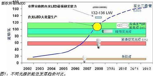 圖1:不同光源的能效發(fā)展趨勢(shì)對(duì)比。