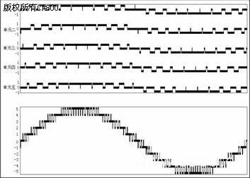 每個(gè)功率單元輸出的電壓波形及其串聯(lián)后輸出的相電壓波形示意圖,可以得到5~0~-5共11個(gè)不同的電壓等級(jí)。增加電壓等級(jí)的同時(shí),每個(gè)等級(jí)的電壓值大為降低,從而減小了dv/dt對(duì)電機(jī)絕緣的破壞,并大大削弱了輸出電壓的諧波含量,電壓等級(jí)數(shù)量的增加,大大改善了變頻器的輸出性能,輸出波形幾乎接近正弦波。