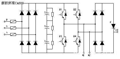 輸入電源端R、S、T接變壓器二次線圈的三相低壓輸出,三相二極管全波整流為直流環(huán)節(jié)電容充電,電容上的電壓提供給由IGBT組成的單相H形橋式逆變電路。