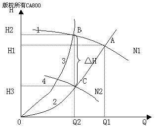 如果采用變頻調(diào)速控制方式,將風(fēng)機(jī)轉(zhuǎn)速由N1降到N2,根據(jù)風(fēng)機(jī)的比例定律,可以畫(huà)出在轉(zhuǎn)速N2下壓力H和流量Q特性如曲線4所示,可見(jiàn)在滿(mǎn)足同樣風(fēng)量Q2的情況下,風(fēng)壓H3將大幅度降低,功率P3(相等于面積CH30Q2)也隨著顯著減少,節(jié)省的功率△P=△HQ2與面積BH2H3C成正比,節(jié)能的效果是十分明顯的。