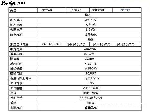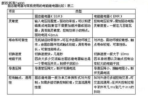 3)固態(tài)繼電器產(chǎn)品特點(diǎn): ●過零觸發(fā),投入時(shí)無浪費(fèi)電流,分?jǐn)鄷r(shí)不產(chǎn)生高壓,大大延長電容器的使用壽命。 ● 投入不產(chǎn)生火花,抖動等瞬態(tài)現(xiàn)象 ● 二個(gè)反并聯(lián)晶閘管和電壓過零觸目驚心發(fā)電路組成的無觸心點(diǎn)式電子開關(guān)響應(yīng)速度快。 ● 采用進(jìn)口玻璃鈍化方形芯片,SBC陶瓷板以用各種導(dǎo)熱絕緣材料封裝而成,模塊一致性能好,工作可靠性高。 ● 輸出功率大,輸出額定電流最大可達(dá)1000A晶閘的VDRM和VRRM達(dá)2200V。 ● 輸入/輸出端與模塊銅底板之間的絕緣耐壓VISO≥2.5KV(RMS),光藕隔離,強(qiáng)/弱電之間的絕緣耐壓達(dá)成7.5KV. 固態(tài)繼電器與常規(guī)使用的電磁繼電器比較:表二