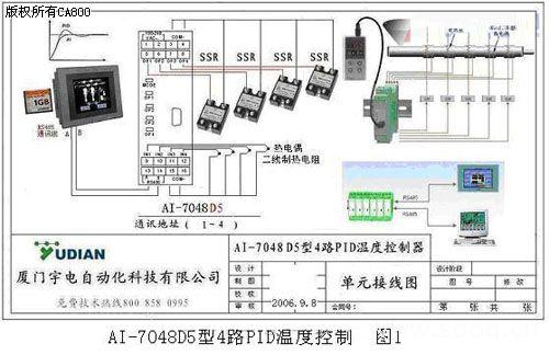 4.1 塑料擠出機(jī)、熱熔膠; 4.2 鞋機(jī)控制系統(tǒng)設(shè)計(jì)時(shí):動作控制用PLC;溫度控制用AI-7048型,可同時(shí)用觸摸屏來顯示控制。 4.3 滌綸拉絲假捻機(jī)臺有45個(gè)加熱缸, 控制長絲拉升軟化溫度。由于原機(jī)臺溫控系統(tǒng)老舊,需要改裝的空間小,又需要觸摸屏控制,已采用AI-7048型4路控制器。