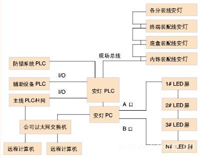 安燈系統(tǒng)的現(xiàn)場控制部分為現(xiàn)場總線的網(wǎng)絡(luò)結(jié)構(gòu),在每一條生產(chǎn)線上根據(jù)工位多少安裝數(shù)個遠(yuǎn)程輸入模塊,單個遠(yuǎn)程模塊發(fā)生故障并不影響其他模塊的運行。安燈現(xiàn)場主站PLC與安燈PC,安燈PC與公司內(nèi)部之間為以太網(wǎng)的網(wǎng)絡(luò)結(jié)構(gòu)形式;安燈PC與LED屏之間為RS485現(xiàn)場總線,保證大數(shù)據(jù)量的傳輸暢通和播放速度要求。安燈系統(tǒng)與主線PLC、輔助設(shè)備PLC等設(shè)備的輸入輸出的信號采用無電壓觸點(I/O無源觸點),即使安燈PC出現(xiàn)故障,也不會影響安燈PLC與設(shè)備的連鎖運行。