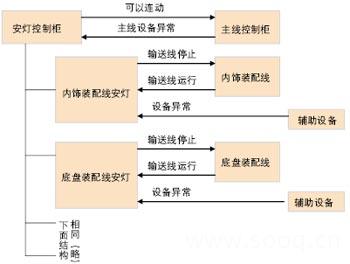 圖4中標(biāo)出了安燈系統(tǒng)與輔助設(shè)備的I/O連鎖信號概要(A種方式),是否進(jìn)行B種方式的通信可根據(jù)該輔助設(shè)備的需要來確定。特別指出的是,出于運行安全考慮,輔助設(shè)備與主線連鎖信號不要進(jìn)入安燈控制柜,而應(yīng)由輔助設(shè)備控制柜與主線控制柜間單調(diào)連接。