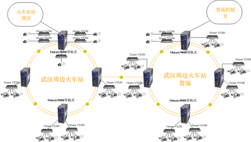 四、方案說明 火車站及貨場根據(jù)自己工作需求分別都有自己需要監(jiān)控的點位,火車站有21個監(jiān)控點位,主要用來監(jiān)控火車站進出站火車運行情況、候車大廳旅客候車情況、車站前后廣場人員流動情況。貨場共有30個監(jiān)控點位,主要用來監(jiān)控貨運火車進出貨場情況、貨場火車裝卸貨物情況、貨場內的安全情況?;疖囌揪嚯x貨場15公里。我們考慮到主要傳輸?shù)臑橐曨l數(shù)據(jù)流,為了避免帶寬瓶頸的問題采用Omate 9000千兆工業(yè)以太網(wǎng)搭建數(shù)據(jù)傳輸?shù)闹鞲删W(wǎng)絡,主干網(wǎng)絡由兩個Omate 9000雙纖自愈環(huán)網(wǎng)構成,通過光纖直連達到資源的共享。Omate VS200視頻編解碼器根據(jù)業(yè)務的需要,掛接在Omate 9000上,用來采集前端的視頻監(jiān)控信號。