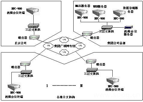 此視頻會(huì)議系統(tǒng)采用RJ-45端口,IP方式連接,多點(diǎn)視頻會(huì)議服務(wù)器通過(guò)交換機(jī)和路由器與計(jì)算機(jī)廣域網(wǎng)絡(luò)連接,通過(guò)數(shù)字傳輸信道,以專線方式星形級(jí)聯(lián)而成。