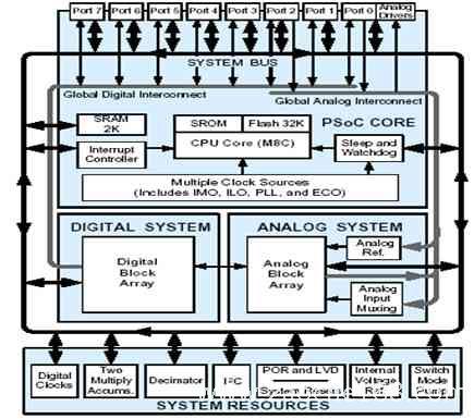 EZ-Color控制器是Cypress半導(dǎo)體有限公司生產(chǎn)的專門針對高亮度LED照明混色應(yīng)用的可編程片上系統(tǒng)芯片。它主要由8位微處理器,可編程模擬模塊和數(shù)字模塊,外加硬件乘法累加器、I2C、閃存、SRAM等周邊外圍模塊組成,如圖1所示。