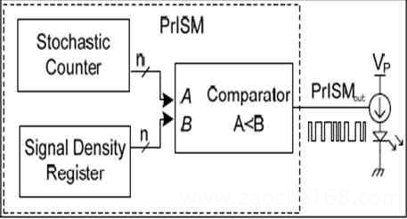 賽普拉斯的EZ-Color方案的亮度控制采用了賽普拉斯的專有的PrISM技術(shù)。相比于PWM控制方法它可有效地解決電磁干擾與低頻閃爍問題。如圖3所示,PrISM技術(shù)通過將隨機(jī)計(jì)數(shù)器與用戶所要求的信號強(qiáng)度寄存器的值進(jìn)行比較,如果隨機(jī)計(jì)數(shù)器里的值小于信號強(qiáng)度值時(shí),就輸出高電平信號,大的時(shí)候就輸出低電平,從而產(chǎn)生高低電平寬度隨機(jī)變化的精確照明脈沖信號。