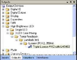 B. 從“輸出驅(qū)動器”列表中的High Brightness LED下面選擇“Triple Luxeon? K2”顏色混合驅(qū)動器,并將其拖到工作區(qū)中(見圖5)。在拖到工作區(qū)釋放后,PSoC express會彈出一個(gè)添加輸出驅(qū)動器窗口。這個(gè)時(shí)候輸入驅(qū)動器“ColorMixer”作為HBLED驅(qū)動名稱后,點(diǎn)擊“ok”即可。