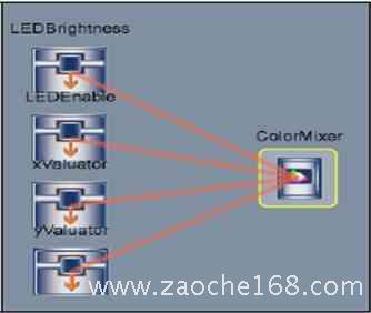 H. 定義輸出與輸入的傳遞函數(shù)關(guān)系:右擊“ColorMixer”輸出驅(qū)動器圖標(biāo),然后選擇傳遞函數(shù)打開傳遞函數(shù)對話框。在傳遞函數(shù)對話框里將作為輸入的4個(gè)變量與輸出傳遞函數(shù)的4個(gè)參數(shù)一一對應(yīng)配置即可,一旦配置完后,如圖9所示,輸出與輸入之間會顯示連接線。
