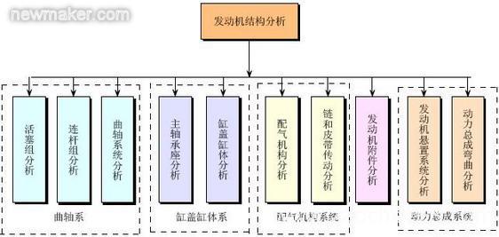 在發(fā)動(dòng)機(jī)的CAE 分析中,主要可分為性能分析、流場(chǎng)分析以及結(jié)構(gòu)分析三個(gè)研究方向,其中結(jié)構(gòu)分析是針對(duì)零部件級(jí)(比如活塞、連桿等)、子系統(tǒng)級(jí)(比如曲軸系)和總成級(jí)(比如整機(jī)和動(dòng)力總成)三個(gè)級(jí)別的對(duì)象進(jìn)行動(dòng)力學(xué)和有限元分析,主要分析內(nèi)容包括分析各級(jí)別對(duì)象的剛度、強(qiáng)度、疲勞、模態(tài)、溫度、剛體運(yùn)動(dòng)、彈性振動(dòng)等。根據(jù)現(xiàn)代發(fā)動(dòng)機(jī)開(kāi)發(fā)的要求以及以往的開(kāi)發(fā)經(jīng)驗(yàn),發(fā)動(dòng)結(jié)構(gòu)分析的基本內(nèi)容如圖1 所示。