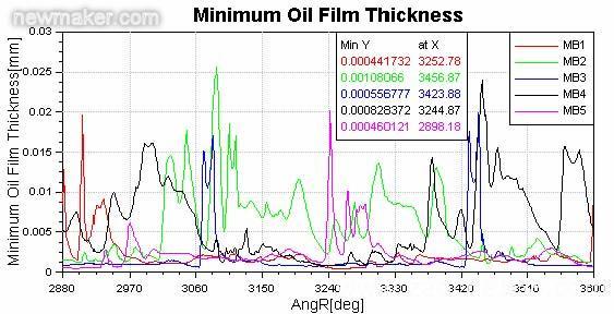 2 表示某帶液力變矩器的曲軸有限元模型,該模型包含曲軸所有的部件,由絕大部分六面體單元和少量四面體單元構(gòu)成,單元總數(shù)為251768,節(jié)點(diǎn)總數(shù)為290597。將此模型與連桿、主軸承座等其它部件連接構(gòu)成的動(dòng)力學(xué)模型進(jìn)行分析,得到該曲軸系一系列動(dòng)力學(xué)特性和油膜特性,包括前后端最大動(dòng)態(tài)扭矩、前后端最大動(dòng)態(tài)角位移、各主軸頸在工作循環(huán)內(nèi)受到的瞬態(tài)力與力矩、各主軸承最小油膜厚度、最大油膜壓力等等。其中,圖3 表示前后端最大動(dòng)態(tài)角位移,圖4 表示各主軸承最小油膜厚度?;谝陨系膭?dòng)力學(xué)結(jié)果,通過(guò)有限元計(jì)算得到曲軸在一個(gè)工作循環(huán)內(nèi)的瞬態(tài)應(yīng)力如圖5 所示,進(jìn)而根據(jù)曲軸材料特性和瞬態(tài)應(yīng)力結(jié)果得到曲軸關(guān)鍵點(diǎn)的疲勞安全系數(shù)。