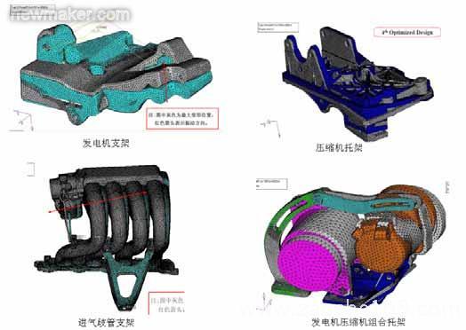 12 表示某發(fā)動(dòng)機(jī)發(fā)電機(jī)支架、壓縮機(jī)托架、進(jìn)氣歧管支架以及發(fā)電機(jī)壓縮機(jī)組合托架四個(gè)發(fā)動(dòng)機(jī)附件的模態(tài)分析結(jié)果。